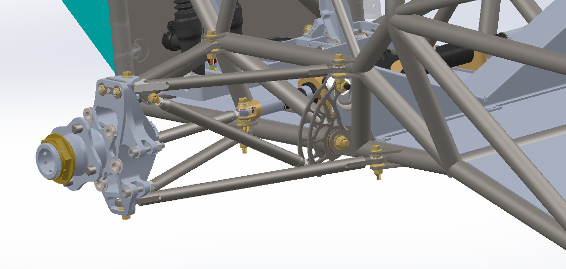 Designed suspension hardware in SolidWorks within large, tightly constrained assemblies, ensuring moving components maintained required clearances throughout full travel.
