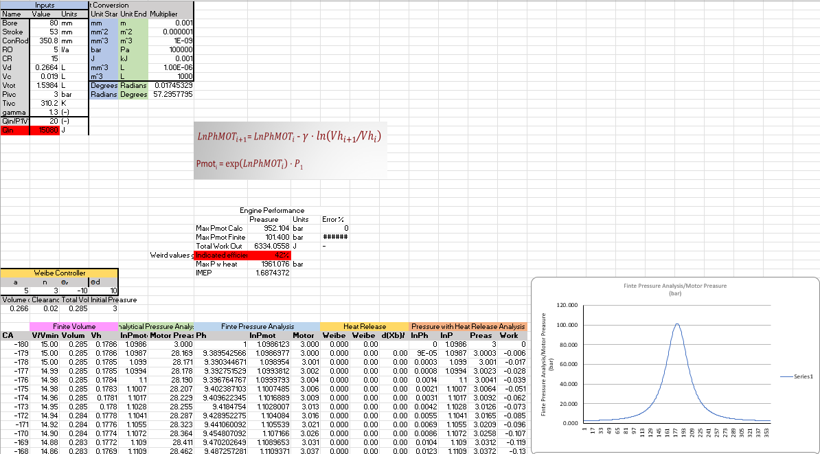 The basics of the table was to take the Crank Angle then solve for Finite Volume which enabled us to solve for Analytical Pressure and Finite Pressure. This coupled with the Wiebe Function and Rate of Heat Release we were able to solve for the cylinder Pressure with Heat Release and then solve for the Work from the engine.