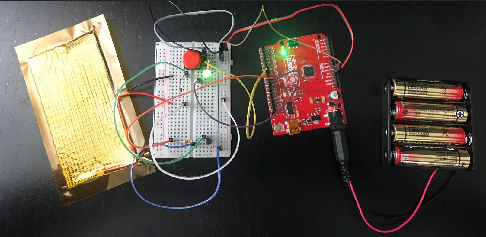 Our Prototype internals was running off 4 AA batteries, an Arduino Tiny, and a generic breadboard. This was meant to test the components of our circuit and the temperature hysteresis prior to miniaturization. We added an LED to indicate when the heating pad was being powered for testing purposes. The code for the temperature hysteresis was set to turn on the bag at 60 degrees Fahrenheit and turn off the heating pad at 70 degrees Fahrenheit.